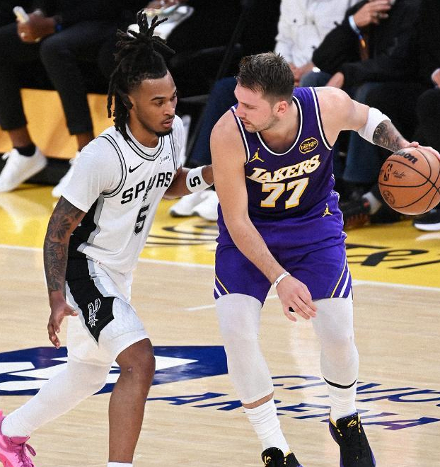 决胜节伊始,拉拉维亚用一记精准的中距离跳投打破得分荒,沃特斯立即回敬一记三分。海斯与艾顿轮番冲击内线,湖人的强势反扑迫使马刺请求暂停。暂停归来,索汉命中关键三分稳住局势,但东契奇的上篮和八村塁的三分让分差回到2分,比赛进入最后三分钟的生死时刻。东契奇与文班亚马轮流站上罚球线,每一分都牵动着现场观众的心弦。终场前1分11秒,东契奇在弧顶命中一记价值连城的后撤步三分,这记“穿心箭”让湖人反超1分。下一个回合,文班亚马在包夹中被迫传球,但队友的外线投篮砸框而出。更糟糕的是,文班亚马在防守端领到个人第六次犯规,犯满离场。这位马刺核心在下场时神情落寞,显然对这个结局难以接受。