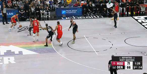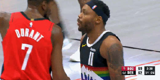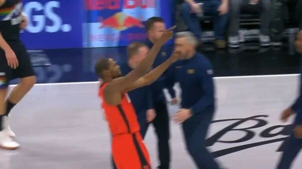 在加时赛还有1分40秒结束的时候,杜兰特对约基奇的盖帽没有犯规,裁判吹了杜兰特犯规。
